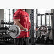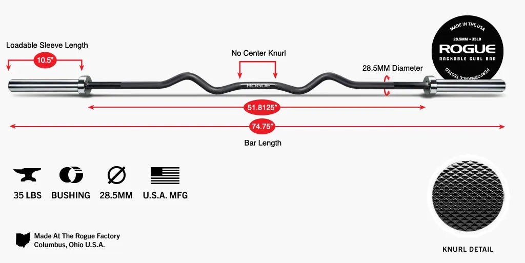 Rogue ラック対応カールバーは、オリジナルのRogueカールバーと同じキャンバーデザイン、ローレットパターン、Eコート仕上げを採用していますが、スリーブ間の距離が20インチ追加されており(51.8125インチ vs 31.5インチ)、ほとんどの標準的なパワーラックに掛けて使用することができます。