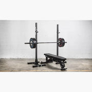 本製品には、高さ72インチ(約183cm)のInfinityシリーズ対応アップライト2本が付属しており、ベンチプレスに適したウエストサイズパターンのホール間隔(1インチ刻み)が採用されています。これにより、付属のJカップを細かく高さ調整することが可能です。