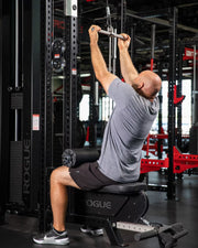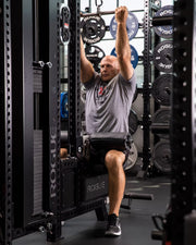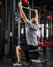 プレスダウン系の動作に効果的で、ラットプルダウンマシンのローロー部分に取り付けることで、ローイングやカールにも使用できます。