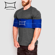 タイトにフィットするのが正常です。最初は窮屈に感じますが、生地にも多少の伸縮性があり、数回使ううちに慣れて問題なくなる例が多いです。適切なサイズであれば血流が止まるほどではなく、トレーニング中に痛みを感じないよう設計されています。ただし明らかな痛みや痺れを感じる場合はサイズの再検討をしてください。