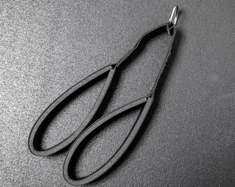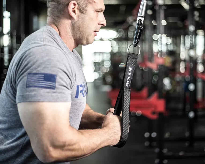 Made from durable 1.5" wide nylon webbing , the Rogue Tricep Strap is designed to attach to lat pulldowns and other cable machines with a welded galvanized D-ring . Please note that a carabiner is not included .