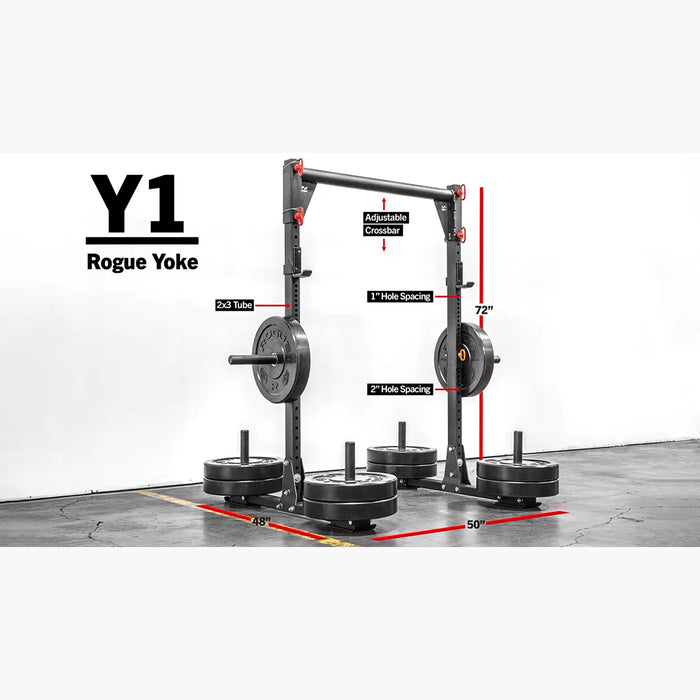 このヨークは、ストリートで活躍するために作られました。従来のスクワット/プレススタンド、ヨーク、またはプッシュ/ドラッグとして使用できます。アメリカ製のRogue  Y-1 ヨークは、2 x 3インチの11ゲージ鋼製の垂直支柱、汎用的なスキッド/ストレージフット、750LB(約330kg)を超える耐荷重を備えています。クラシックなストロングマンのトレーニングツールの現代的なアプローチである72インチのY-1は、Yシリーズの中で最もコンパクトで操作しやすく、ほとんどのトレーニングスペースに簡単に配置でき、50インチ x 48インチ(約130cm x 120cm)のフットプリントを提供します。